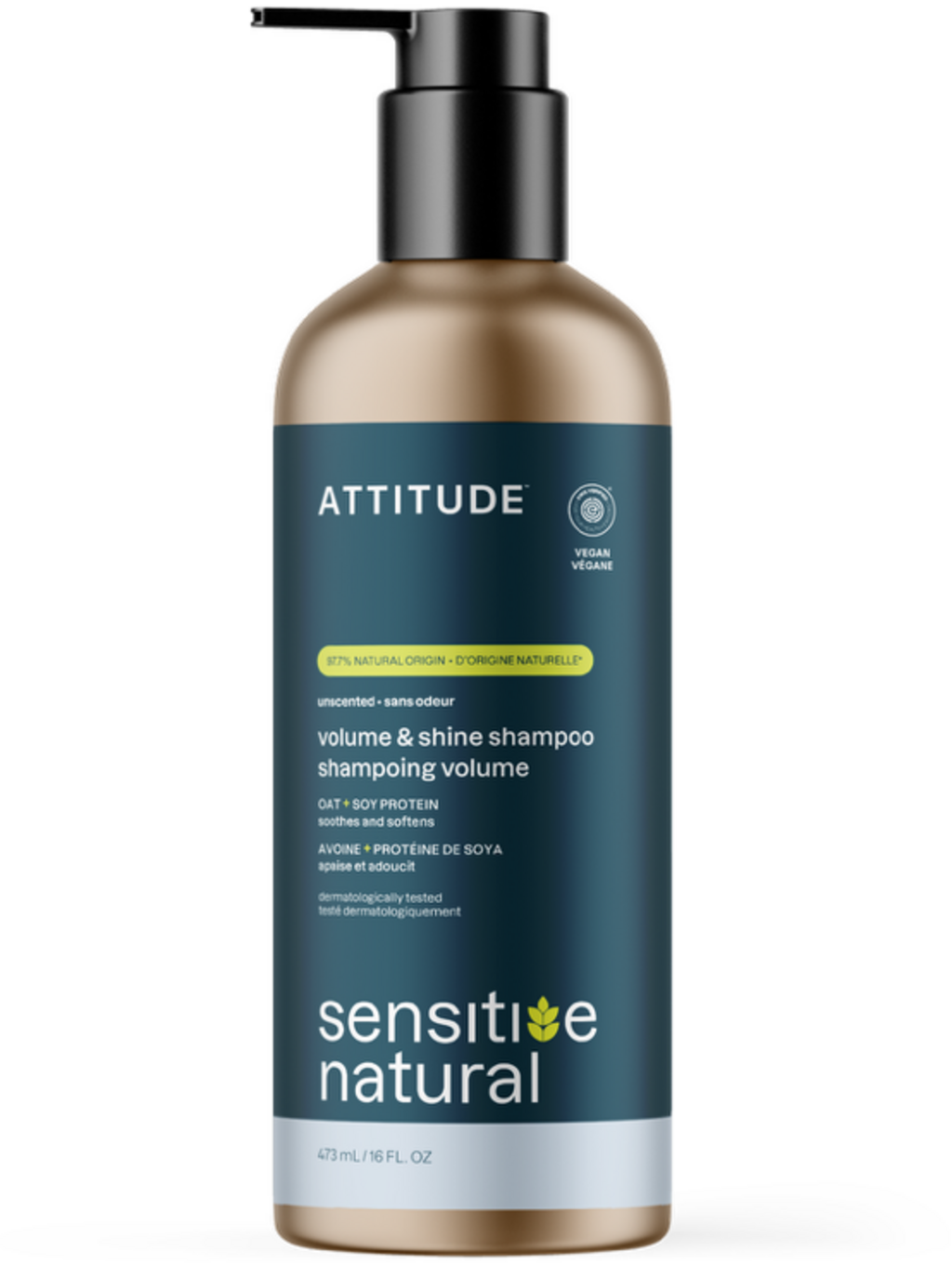 Натуралният шампоан ATTITUDE® sensitive във варианта Volume & Shine е специално адаптиран към нуждите на чувствителния скалп. Веганската формула е напълно без аромат и използва екстракт от овес за подобряване на външния вид на косата. Тя съдържа соев протеин за допълнителна лекота и придава на косата видим обем. Проверен от EWG® и дерматологично тестван, шампоанът се предлага в минималистична алуминиева бутилка за многократно пълнене за екологично съобразена ежедневна употреба.