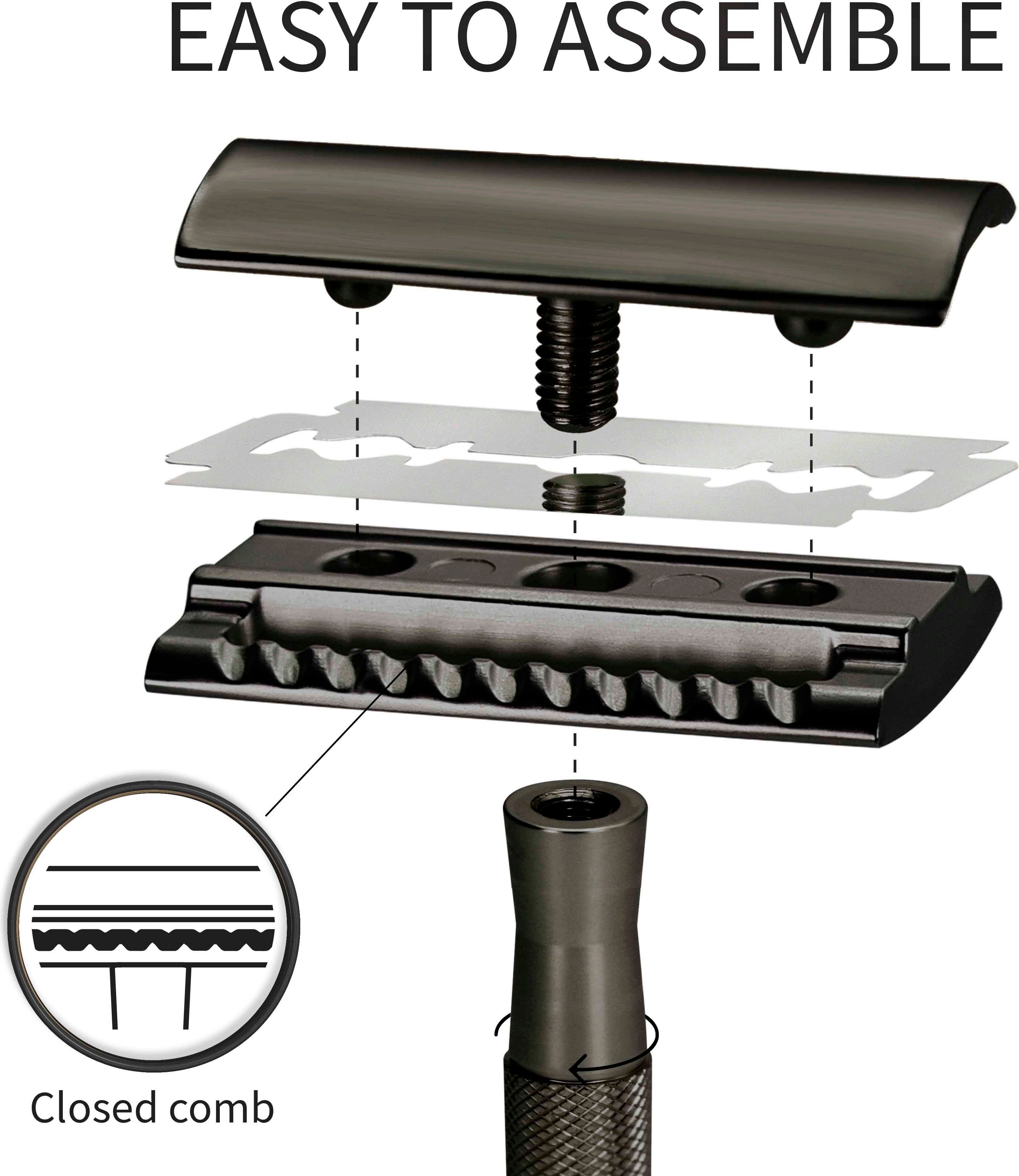 Безопасната самобръсначка е идеална и устойчива алтернатива на обикновените мокри самобръсначки. Проектирана е както за мъже, така и за жени, а затворената глава улеснява начинаещите да преминат към устойчиво бръснене. Бръсненето се извършва с помощта на остри бръснарски ножчета, които осигуряват перфектни резултати и са изключително издръжливи. С практичната стойка за бръснене самобръсначката е винаги под ръка и може да се суши перфектно.