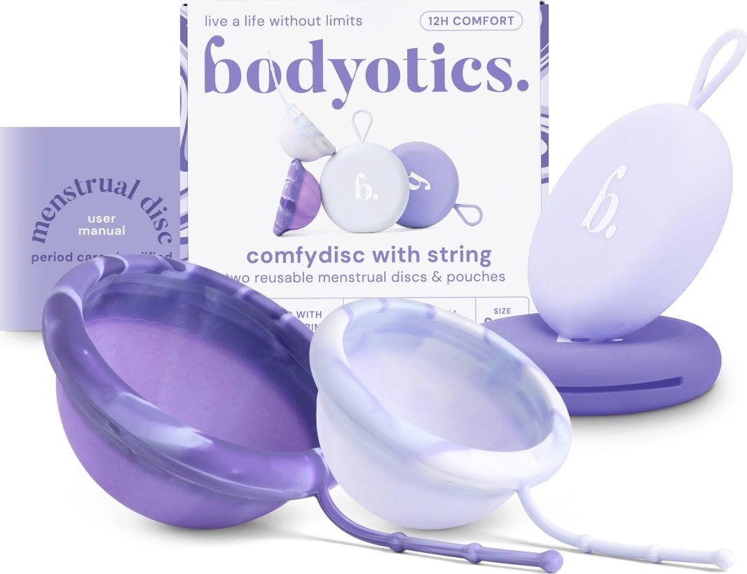 В Comfydisc от Bodyotics ще намерите 2 менструални диска с различни размери, един предназначен за най-силното и един за най-слабото течение. С помощта на практичната корда за сваляне дисковете могат лесно да се свалят. Тъй като в комплекта са включени и 2 силиконови калъфа, можете да смените менструалния си диск по всяко време, когато пътувате, ако нямате възможност да го измиете.