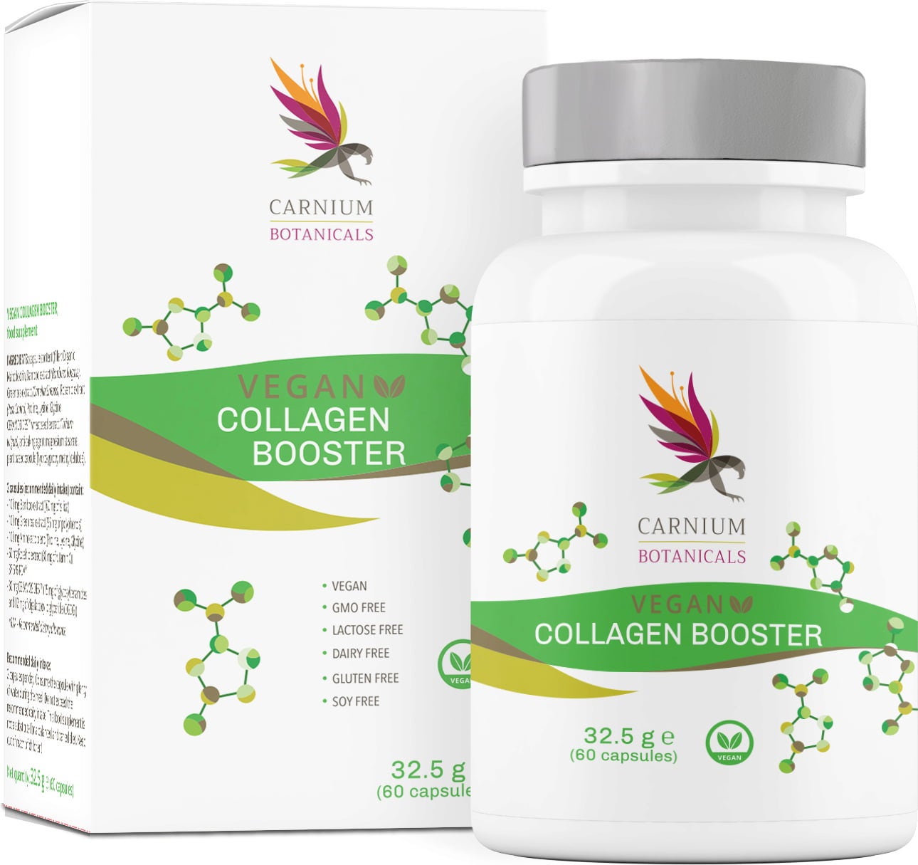 Капсулите Vegan Collagen Booster на Carnium Botanicals могат да подпомогнат естествения синтез на колаген. Те съдържат ценна смес от аминокиселини – пролин, лизин и глицин – както и екстракти от бамбук, зелен чай и шипка. Капсулите są 100% веган и без консерванти.