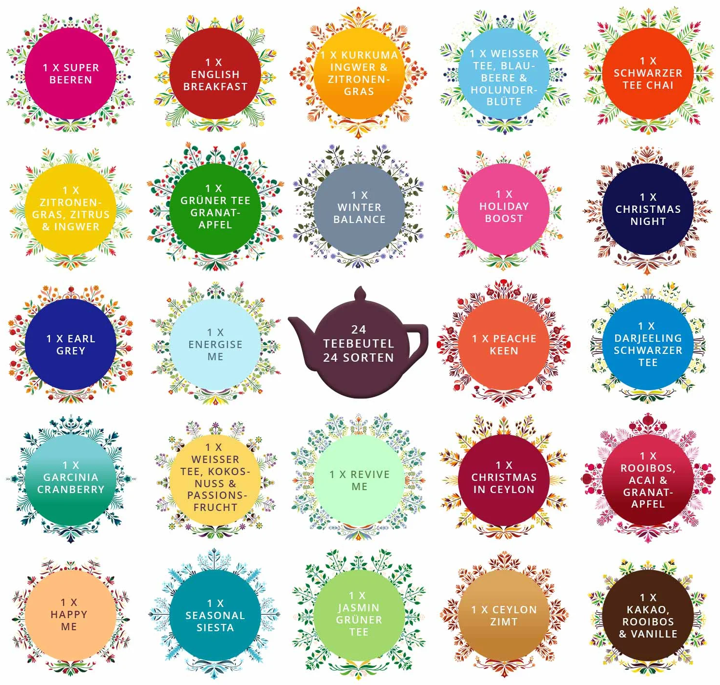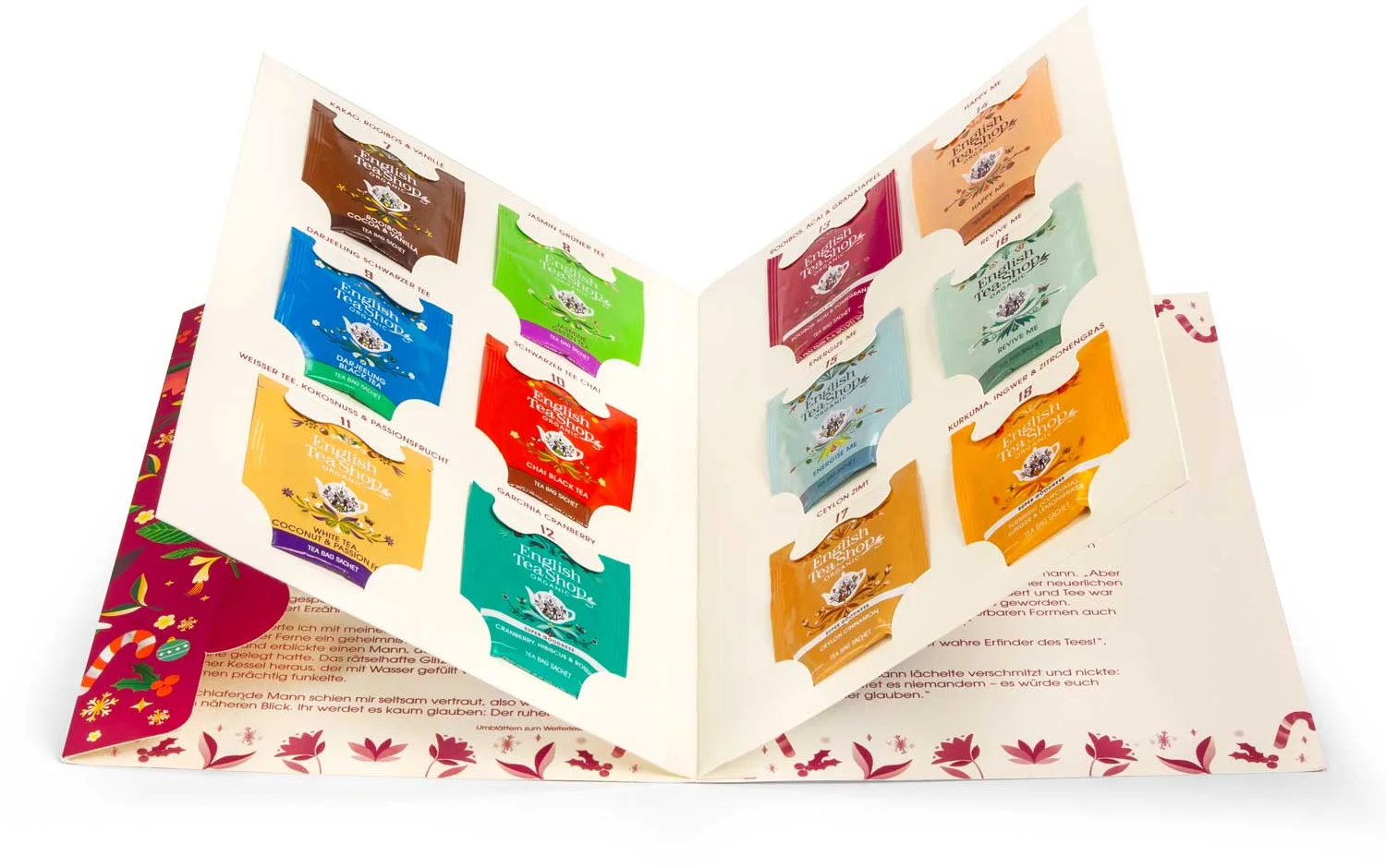 Този специален адвент календар тип „чайна книга“ може да се разлиства като книга и съдържа разпределени на няколко страници 24 био вида чай. Сред тях има и ексклузивни зимни и коледни чайове, придружени от увлекателна коледна история за четене на глас или наум, както и допълнителни изненади. Идеален е за всички любители на чай и за тези, които обичат да си подаряват вкусни моменти на отдих през Адвента.
