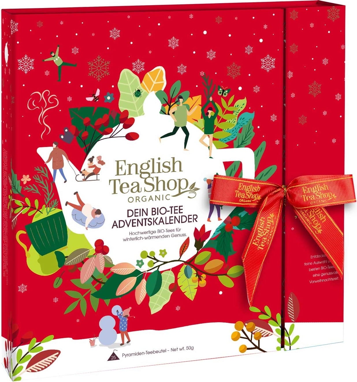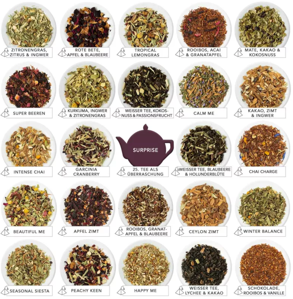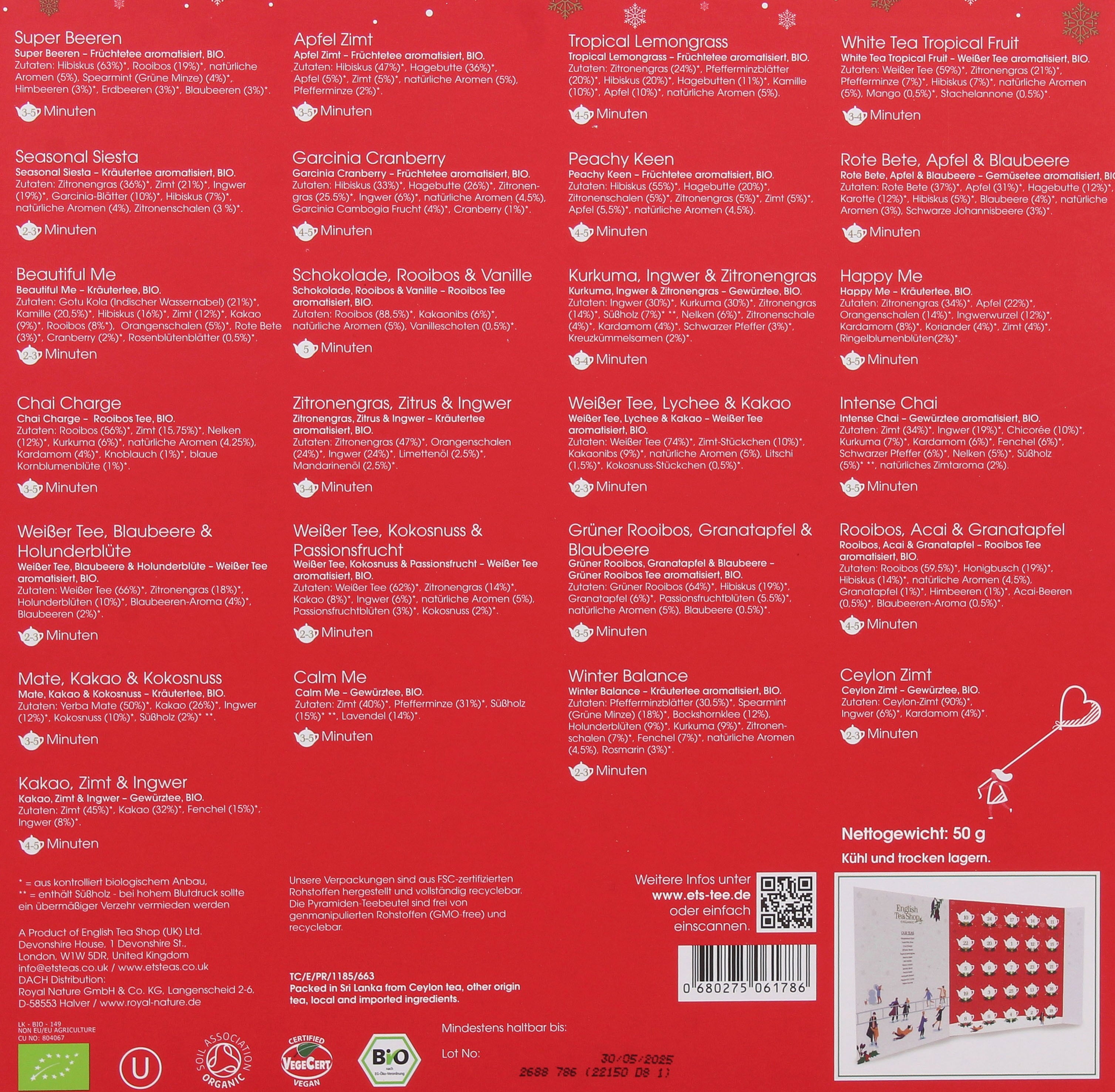 Зад всяко прозорче се крие различен вид коледен чай в най-добро био качество. Асортиментът варира от ароматизирани плодови и билкови чайове, през подправъчни чайове, ройбос и бели чайове. Бонус: сгъваемият календар има дори допълнително прозорче за 25.12.!