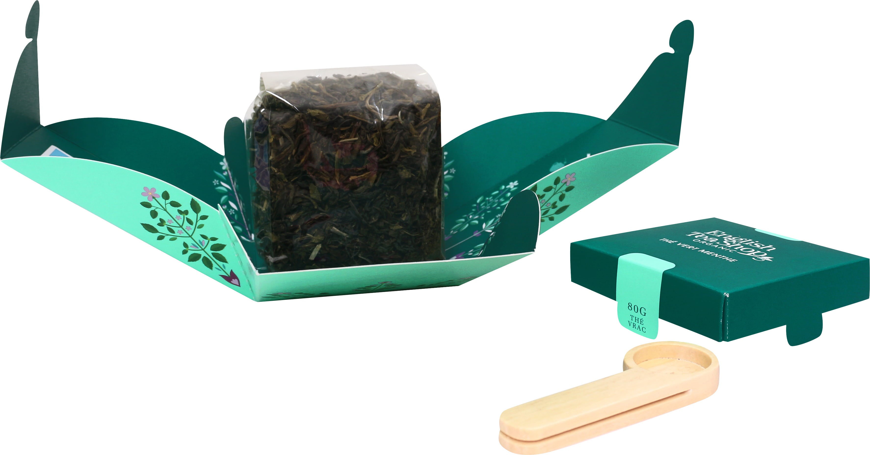 Вкусен е топъл и студен, чист или овкусен с мед и/или лимон. Красивата сгъваема кутия тип оригами включва и малка дървена лъжичка за дозиране – вкусно малко подаръче!