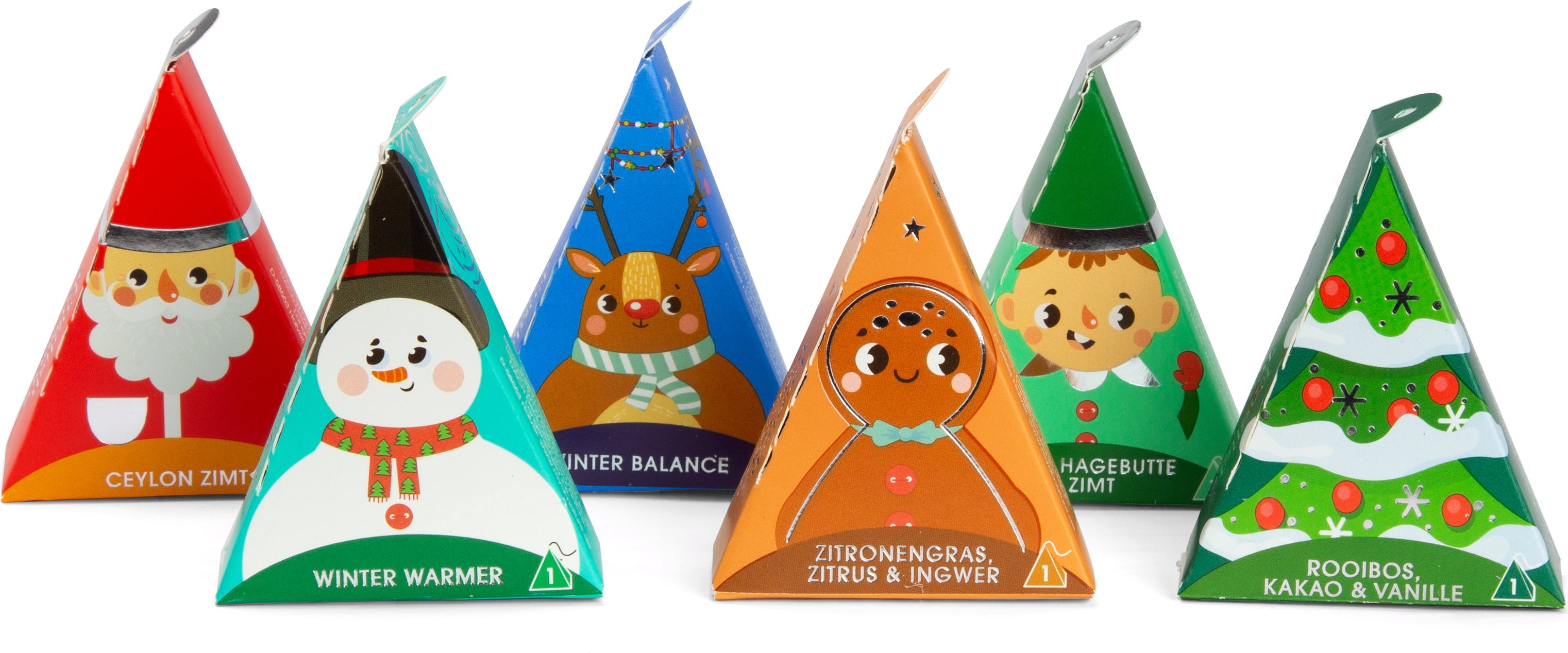 Зимно чайно подаръчно кутия с 12 очарователно оформени коледни помощници. Декоративните кутийки с мотиви, пълни с пирамидални пакетчета, могат благодарение на малък отвор да се използват по много начини – като украса за елха, етикети за подаръци или креативна декорация.