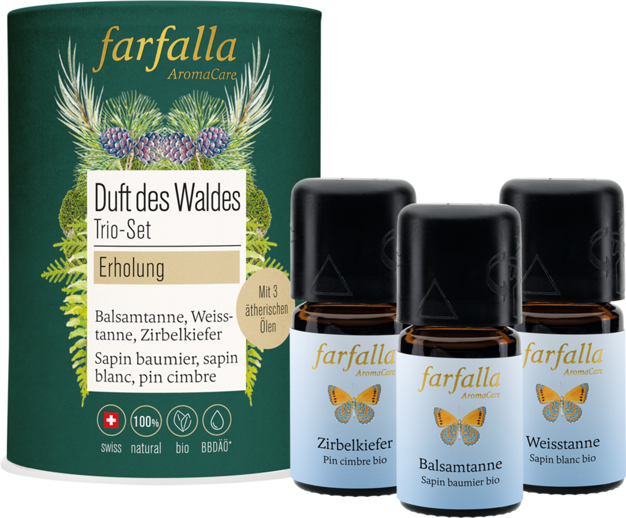 Този комплект се състои от три страхотни аромата, които се съчетават идеално. В ароматерапията тези масла символизират забавяне, заземяване, спокойствие и сила. Наред с други неща, за това са отговорни естествените терпени, съдържащи се в етеричните масла от иглолистни дървета.