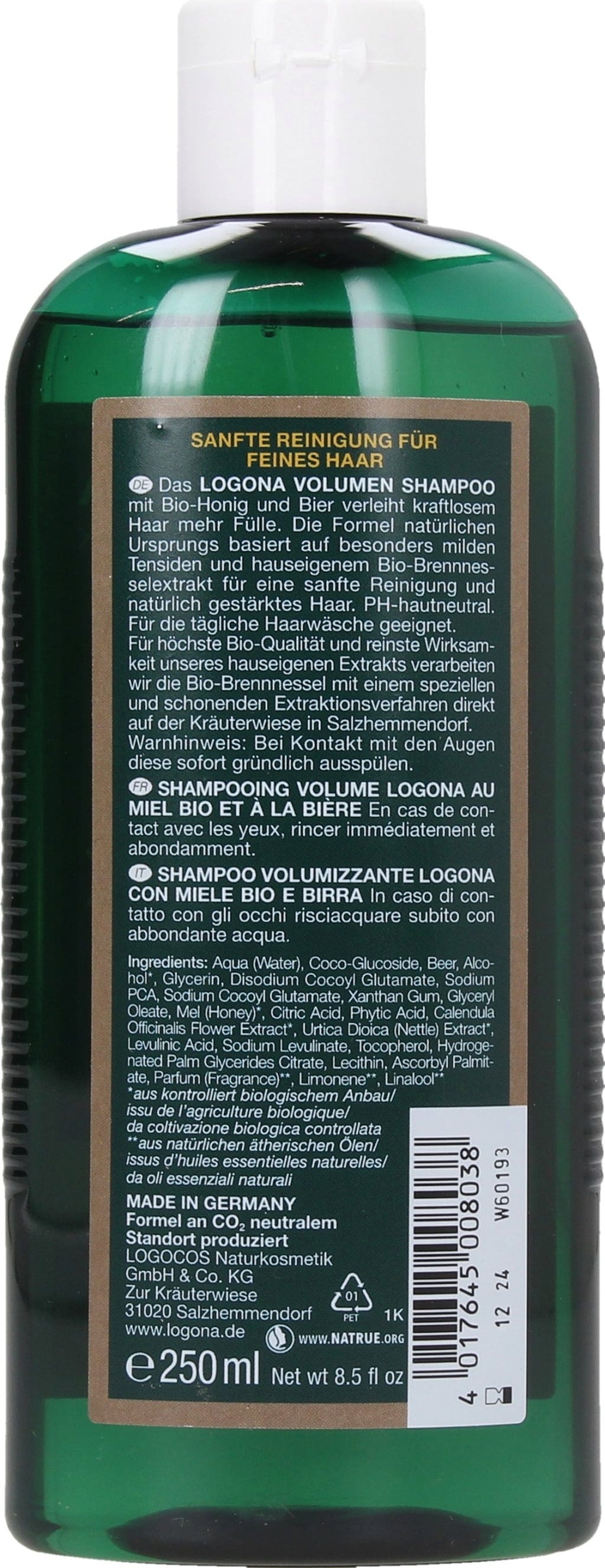 Aqua, Coco Glucoside, Beer, Alcohol[1], Glycerin, Disodium Cocoyl Glutamate, Sodium Pca, Sodium Cocoyl Glutamat, Xanthan Gum, Glyceryl Oleate, Mel (Honey)[1], Citricacid, Phytic Acid, Calendula Officinalis Flower Extract[1], Urtica Dioica (Nettle) Extract[1], Levulinic Acid, Sodium Levulinate, Tocopherol (Vitamin E), Hydrogenated Palm Glycerides Citrate, Lecithin, Ascorbyl Palmitate (Vitamin C), Parfum[2], Limonene[2], Linalool[2]
