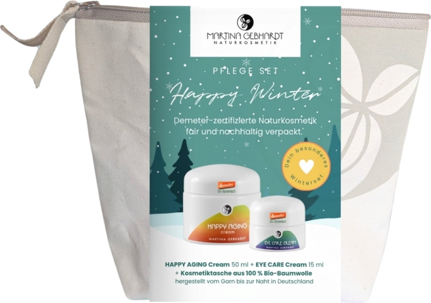Подаръчната чанта "Щастлива зима" съдържа два продукта за грижа за кожата, които са идеални за суха и зряла кожа през зимата. Благодарение на Happy Aging Cream и Eye Care Cream кожата ви получава всичко, от което се нуждае, за да остане защитена и сияйна през студения сезон.