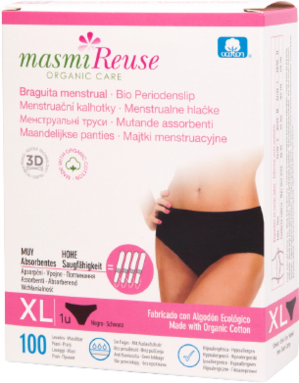 Бикините за по време на менструация от masmi са изработени от сертифициран био памук и са хипоалергенни, меки и особено удобни за носене. Те предлагат високо ниво на абсорбция (сравнимо с четири тампона) и надеждна защита от изтичане благодарение на 3D текстилната технология. Състоят се от три слоя, слой от органичен памук, който е в контакт с интимната зона, абсорбиращата 3D абсорбираща сърцевина от органичен памук и накрая дишащ защитен слой от органичен памук и полиуретан.