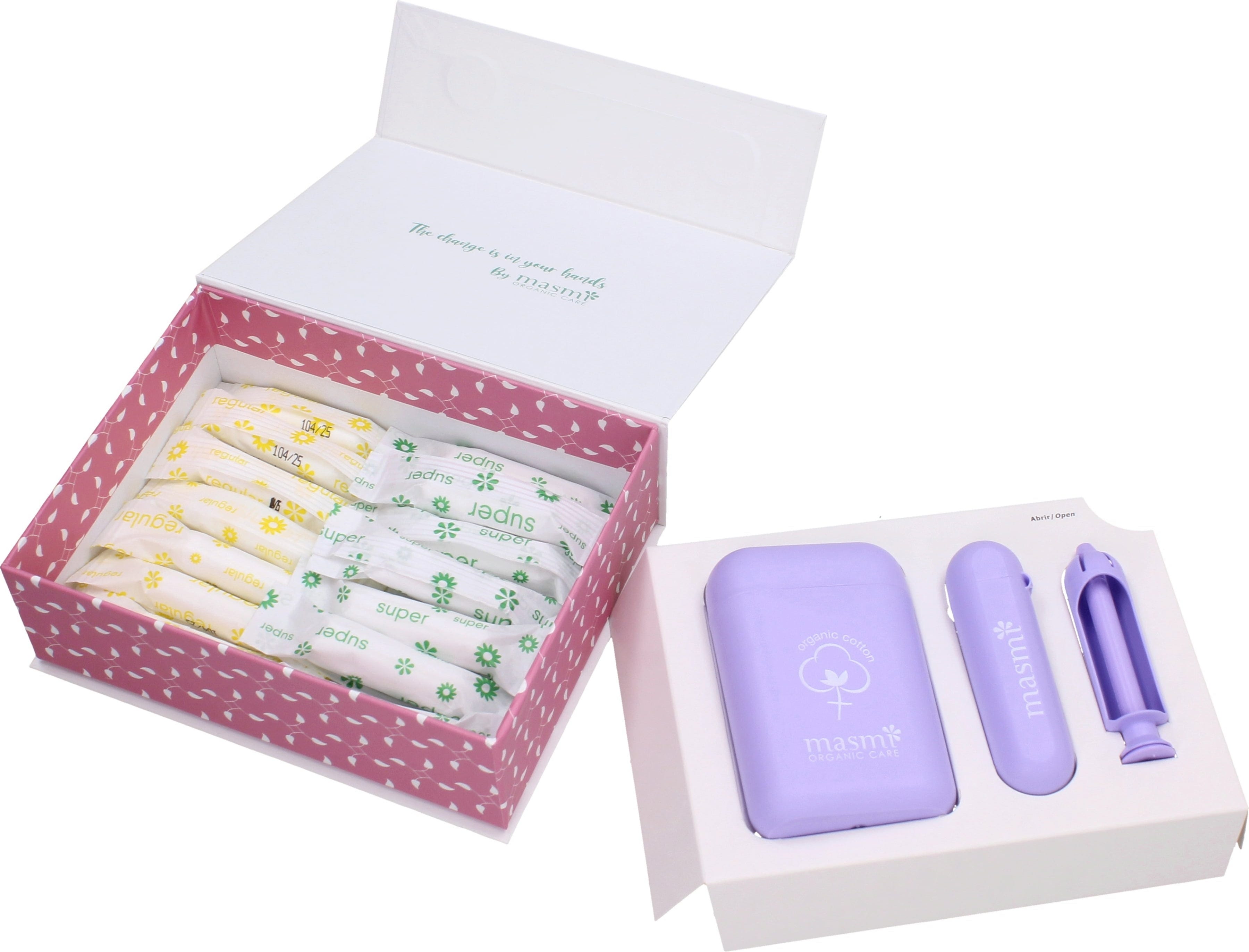 Основният аксесоар в този комплект е апликаторът за многократна употреба, който улеснява поставянето на тампони Masmi. Той е изработен от здрава, хипоалергенна медицинска пластмаса и може да се използва до десет години, като спестява отпадъците, генерирани от апликаторите за еднократна употреба. Аксесоарът също така е много лесен за почистване, достатъчна е течаща вода! Комплектът съдържа и калъф за тампоните, един за апликатора и тампони в два различни размера.