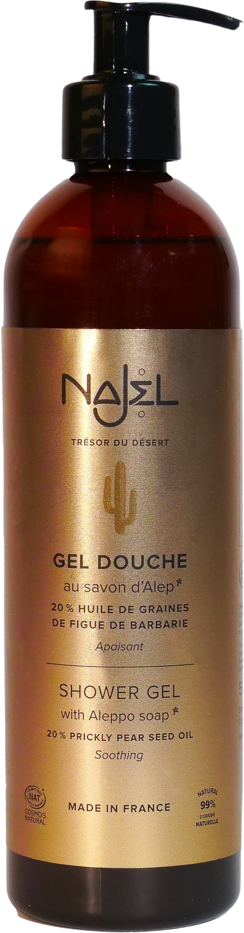 Този душ гел е специално създаден за суха и много суха кожа. Формулиран е на основата на алепски сапун и масло от опунция, като почиства изключително нежно и едновременно подхранва. Не съдържа ароматизатори, сулфати или синтетични добавки и образува много малко пяна.