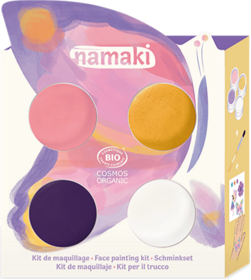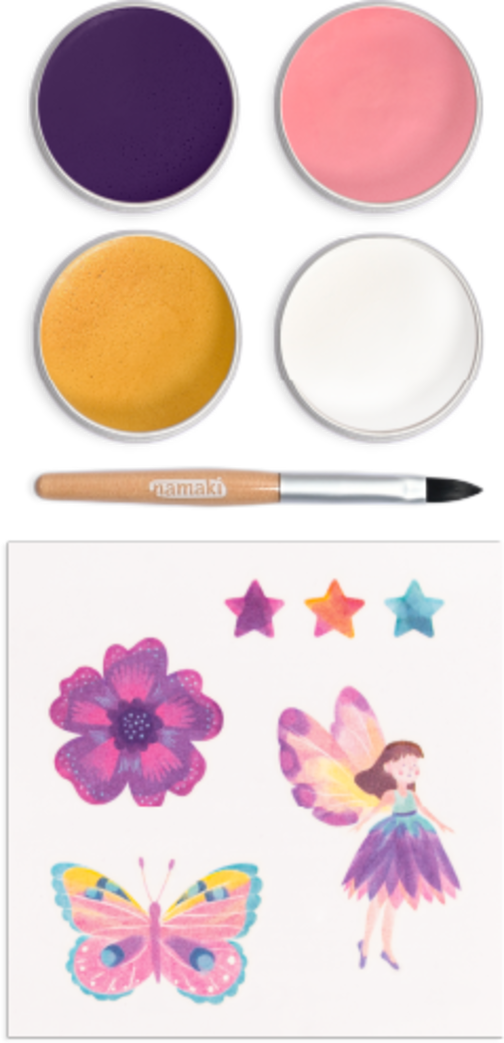 Комплектът за гримиране „Пеперуда“ съдържа кутийки в цветовете розово, лилаво, златистожълто и бяло, с които могат лесно да се създадат мотиви като пеперуда, фея, цветя или дори красива принцеса. Включеният в комплекта лист със залепващи се татуировки допълва дизайните по перфектен начин.