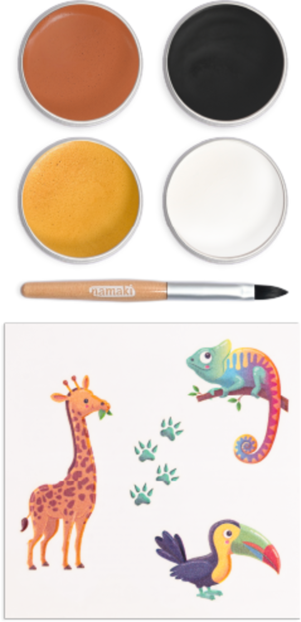 Комплектът за грим Tiger съдържа цветовете черно, бяло, оранжево и златистожълто, така че лесно могат да се нарисуват тигър, леопард, лисица или дори симпатичен жираф. Тематично допълнение към него е включен лист с временни татуировки, с който гримът се завършва.