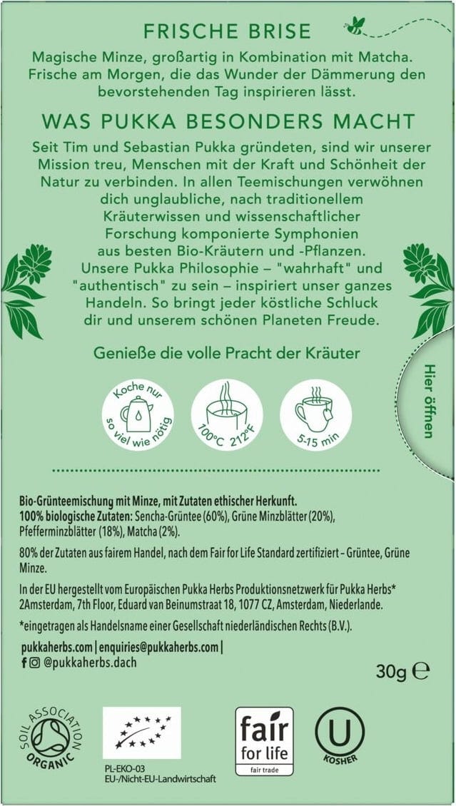 Този уникален зелен чай, формулиран от експертите по билки и диетолозите на PUKKA, съчетава най-новите научни открития с традиционните познания за билките. Резултатът е синергична комбинация от органична мента, мента, зелен чай сенча и матча, създавайки балансирана чаша с охлаждащи аромати и фини, богати нотки. За възхитителна чаша, пълна с ободряващ вкус.
