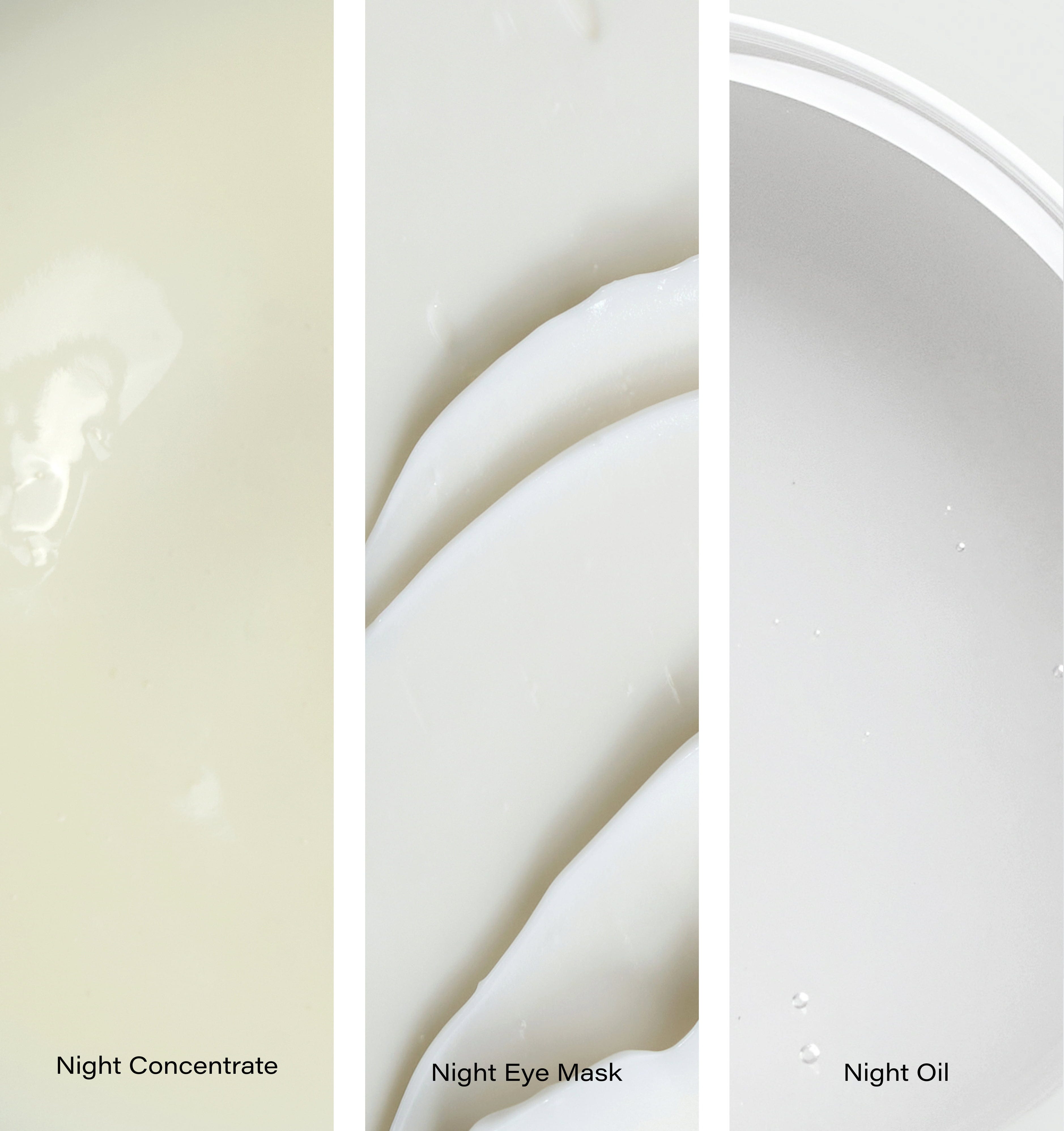 - Стъпка 1: Night Concentrate Листна маска със стволови клетки от Althaea Rosea, хиалуронова киселина и лавандула: стягащи свойства, овлажнява и оставя кожата да изглежда по-гладка през нощта.