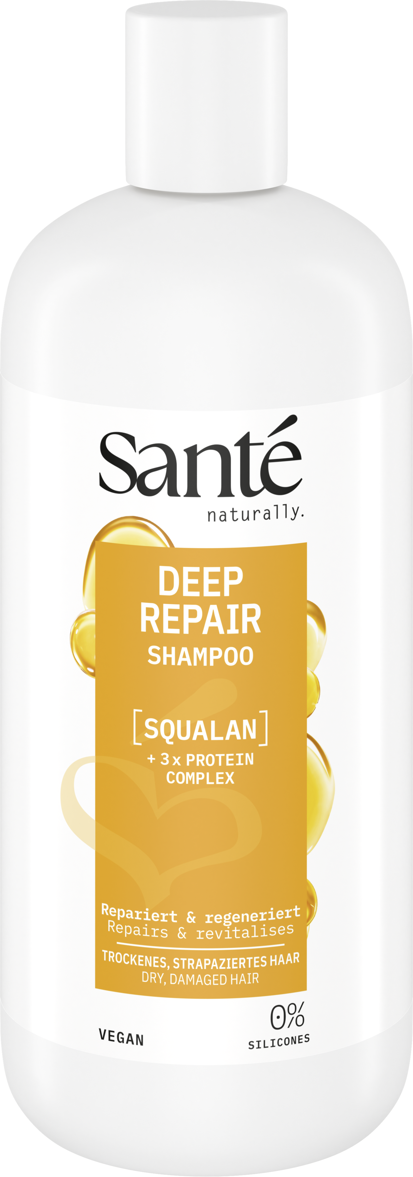 Шампоанът за дълбоко възстановяване на SANTE почиства косата ви от корена до върха с леки почистващи вещества и нежно отстранява себума и стилизиращите продукти. Тройният протеинов комплекс обръща специално внимание на сухата и увредена коса и осигурява интензивно овлажняване. Формулата се допълва идеално от сквалан и осигурява силна и укрепена структура на косата