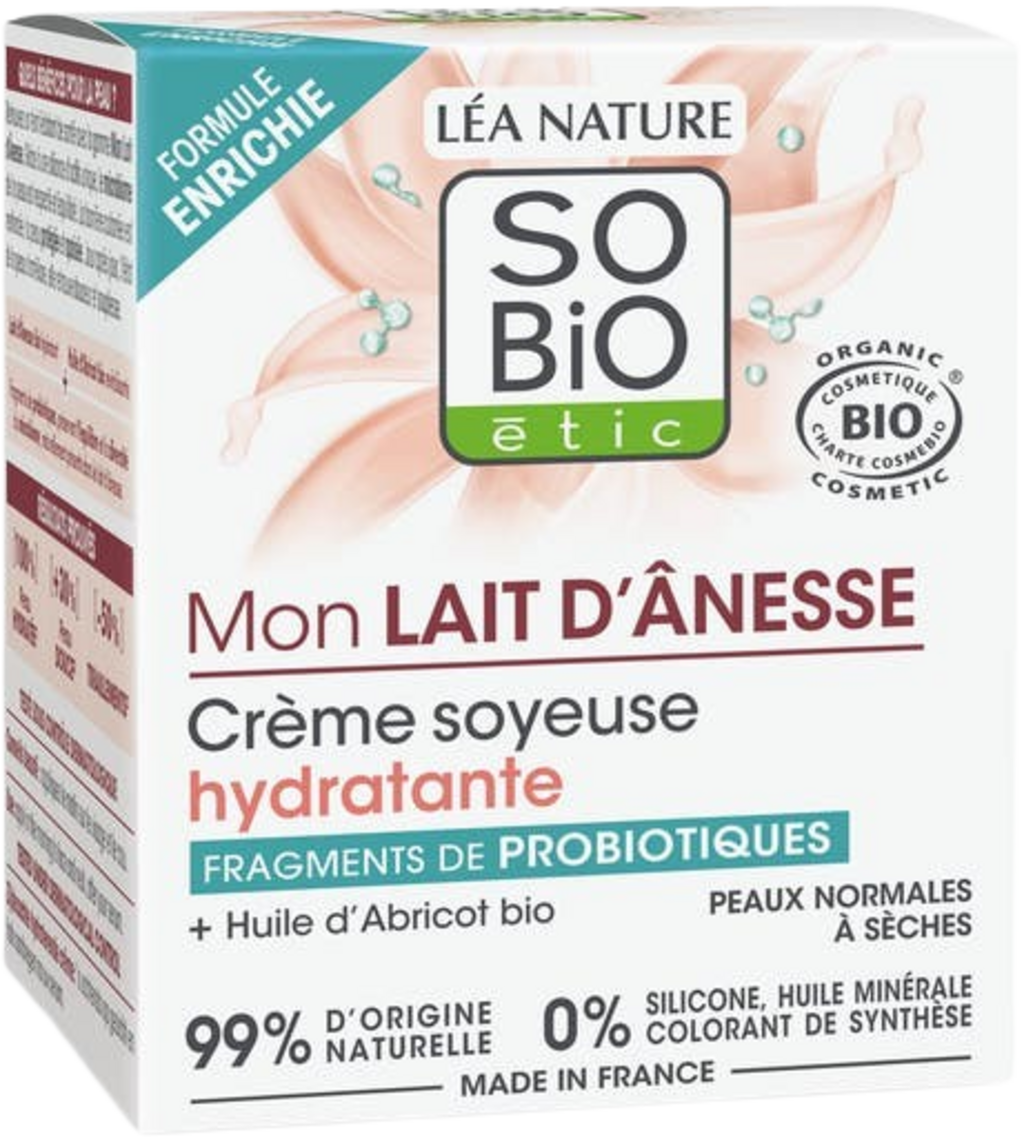 LÉA NATURE SO BiO étic създаде уникален продукт с този копринен овлажняващ крем с магарешко мляко. Меката текстура на този крем се разтапя деликатно върху кожата и образува вкусно ароматизиран защитен филм. Снабдява кожата с влага, защитава я и се грижи за нея да е кадифено мека.