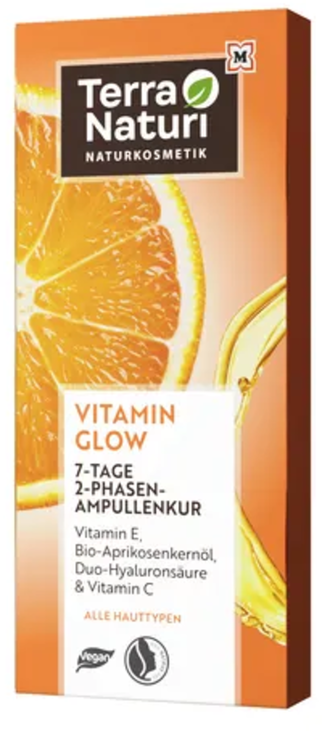 Vitamin Glow 7-дневната 2-фазна ампулна терапия от Terra Naturi глези кожата ви с ценни съставки – сред които дуо-хиалуронова киселина, витамин Е и био-кайсиево масло. Веган формулата в ампулите подхранва кожата интензивно в дълбочина.