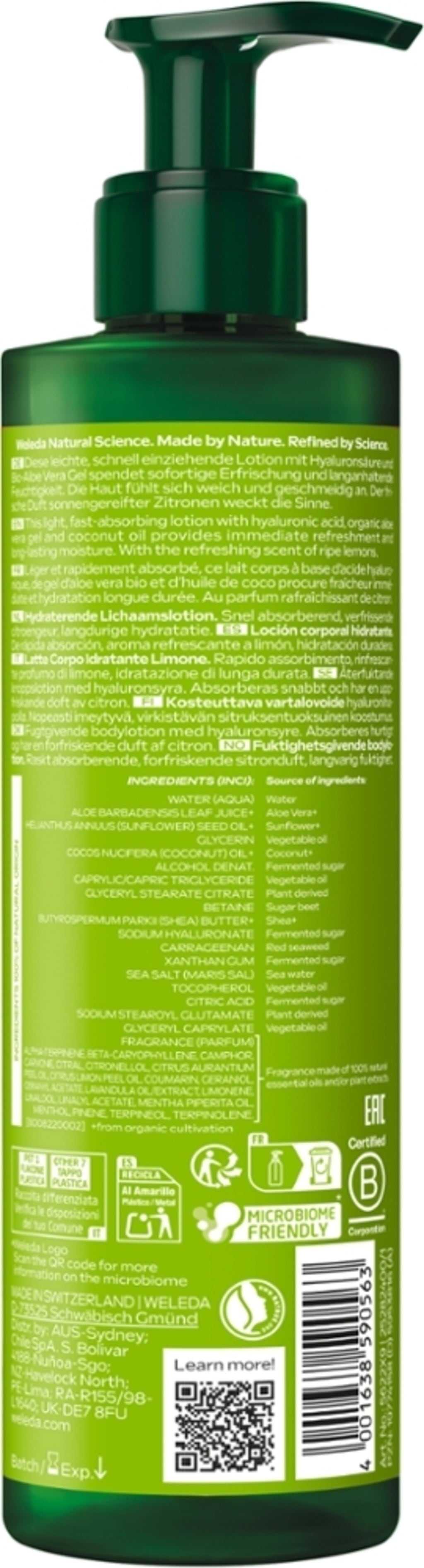 Хидратиращият лосион за тяло се характеризира с лека текстура и бързо попиване. Формулата му съдържа хиалуронова киселина и органичен гел от алое вера, които осигуряват освежаване и дълготрайно овлажняване без лепкавост. Същевременно обгръща кожата със свежия си аромат на лимон.