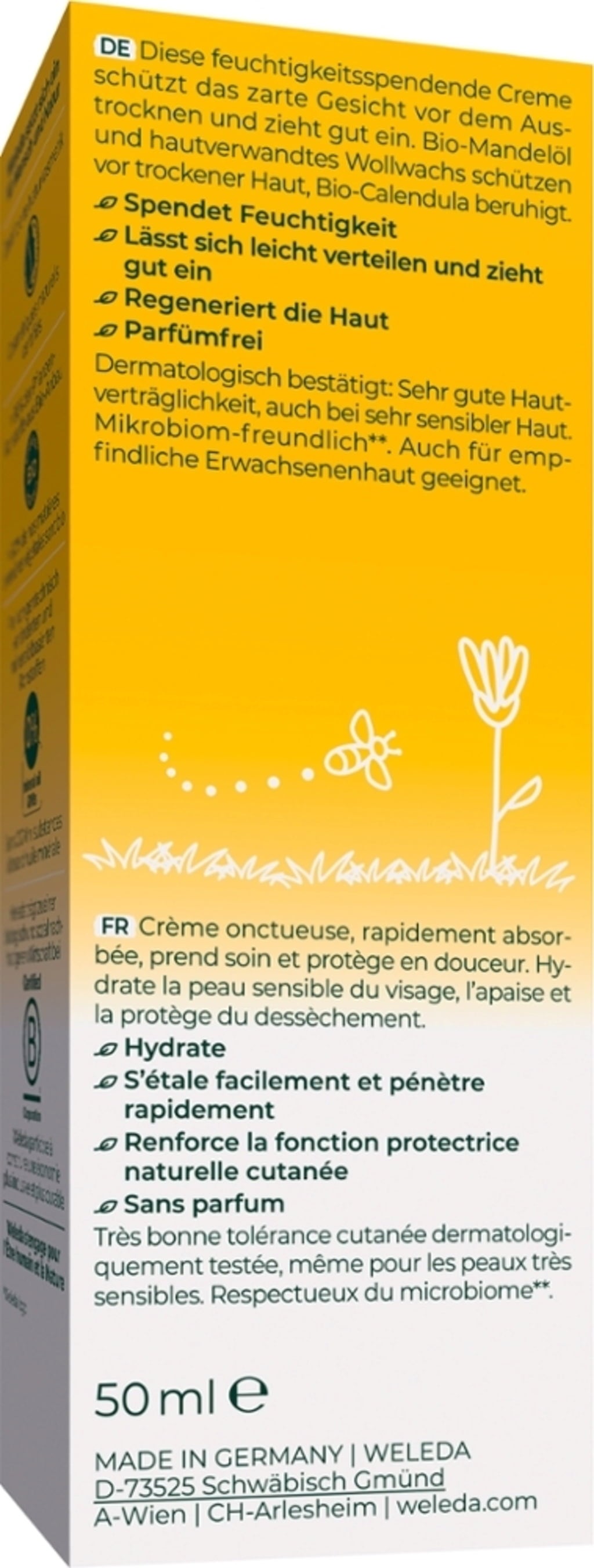 Този особено нежен крем без аромат осигурява оптимална грижа за чувствителната кожа на лицето на малчуганите. Той се абсорбира бързо, овлажнява, предпазва от изсушаване и подхранва с органични съставки като бадемово масло, невен и ланолин. Затова е подходящ и за чувствителна кожа на възрастни.