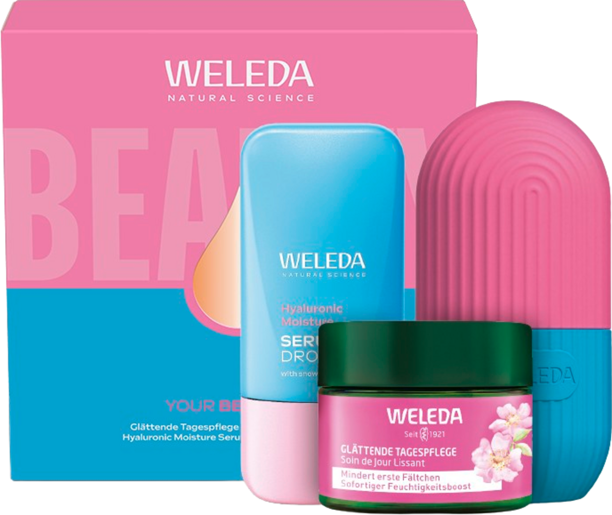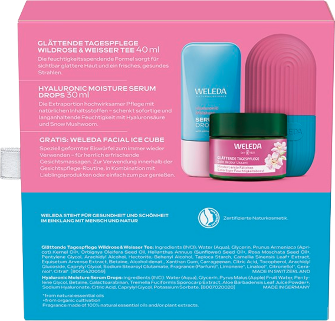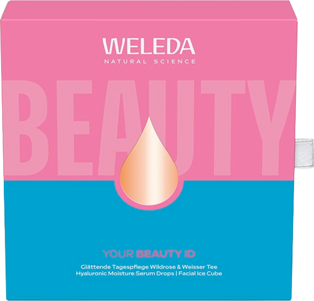 Подаръчен комплект YOUR BEAUTY ID съдържа допълнителна порция ефективна грижа с естествени съставки. Тя се състои от Hyaluronic Moisture Serum Drops като овлажняващ бустер и Изглаждащ дневен крем с дива роза и бял чай. Комплектът се допълва от кубчето за лед за лице за многократна употреба.