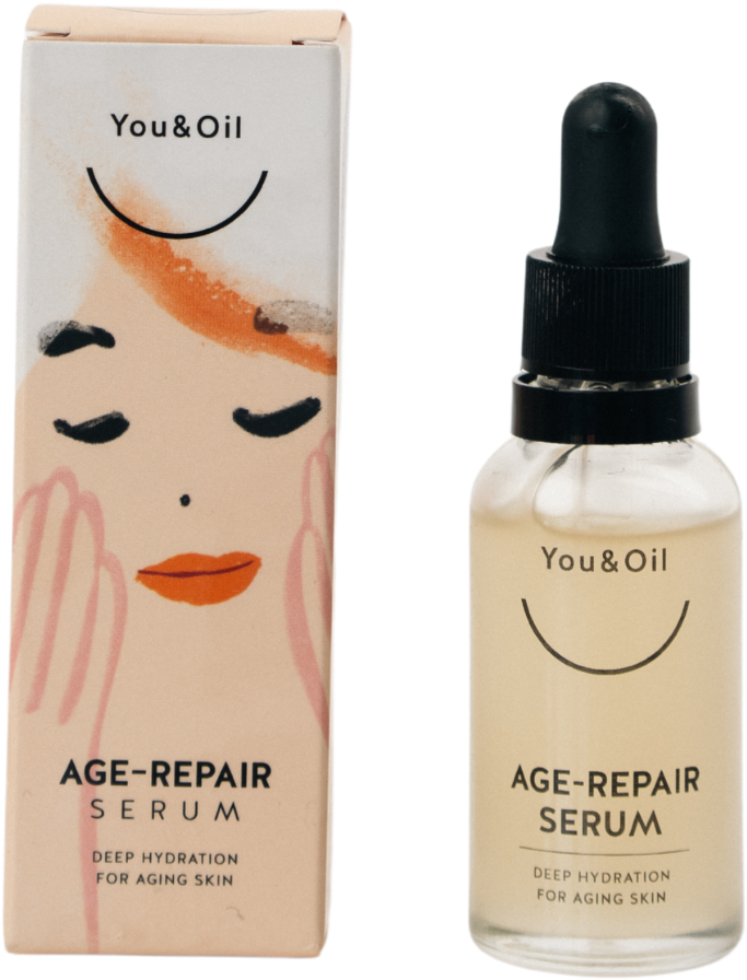 Серумът Age-Repair на You & Oil снабдява застаряващата кожа с ценна хидратация. Розова вода, екстракт от краставица, алое вера и оризов протеин подхранват кожата в дълбочина и допринасят за видимо красива сияйност.